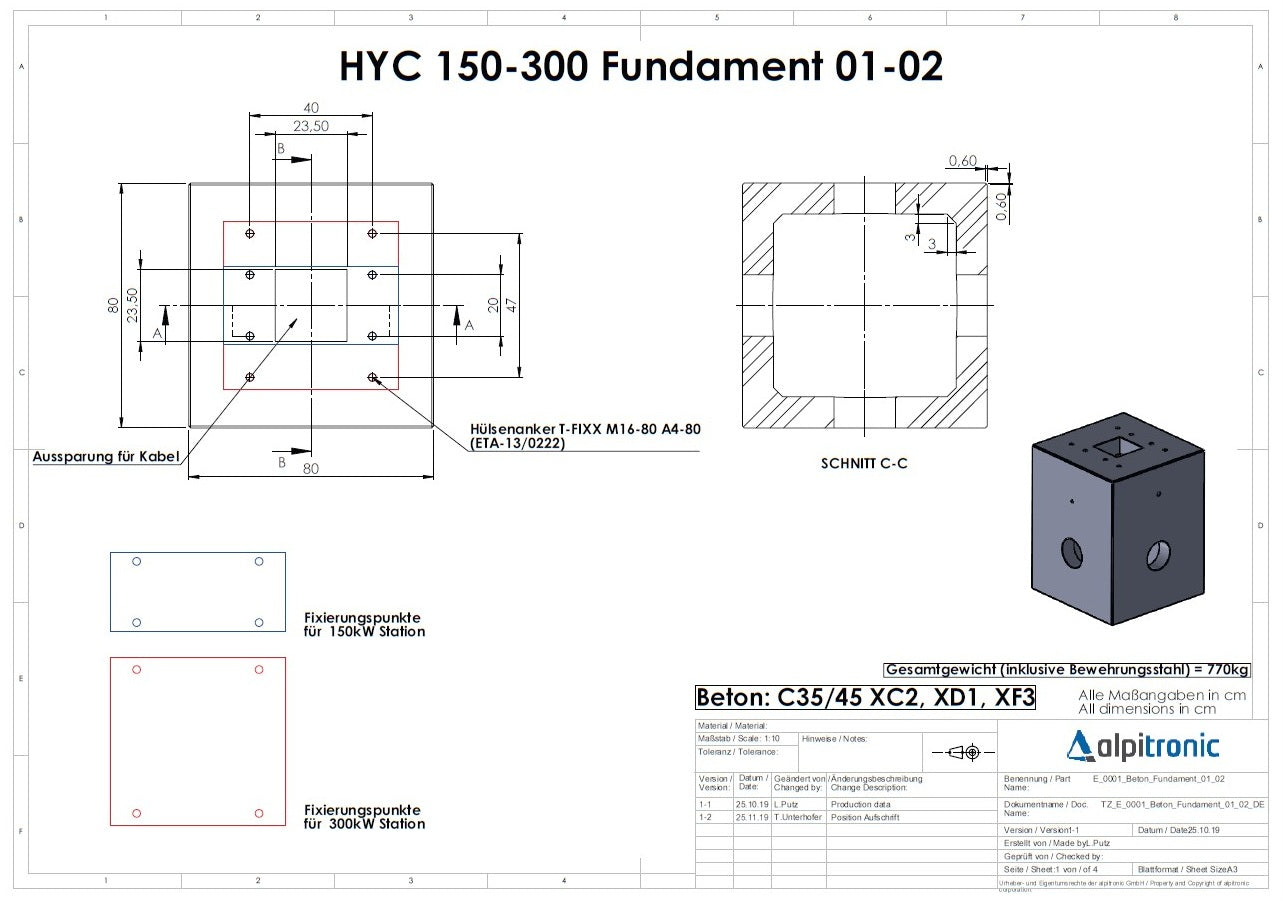 Dieses Fundament ist universell kompatibel mit den führenden DC-Ladestationen der Alpitronic Hypercharger-Serie, einschließlich der Modelle HYC150, HYC200, HYC300 und HYC400. Es wurde speziell vom Hersteller entwickelt, um eine nahtlose Integration der Ladeinfrastruktur zu garantieren.